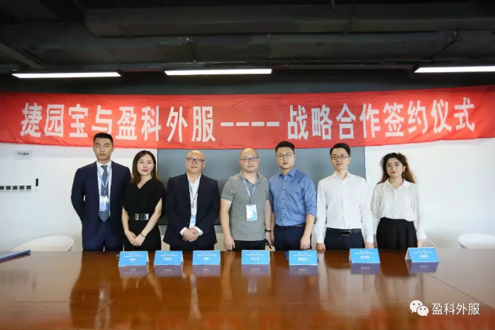 2019年7月8日,盈科外服與捷園寶”戰略合作伙伴”簽約儀式圓滿舉行。捷園寶 CEO鄧禮政、CSO黃鶴,盈科外服投資部總監雷曉杰、投服中心主任邵池池等代表參會。